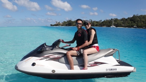 Jet Ski 應該是麥包最期待的行程。應該說很多男生也喜歡這種以速度競賽的運動吧?和很多 Bora Bora 的其他運動一樣,jet ski 行程也有分私人和團體兩種:前者當然就是一個領隊只帶一組人;後者則是一團最多十人,每兩人乘一部 jet ski,一共五部。報名時有註明團體行程最少要有兩部 jet ski 才成行的,我還特地去詢問了不成團機會大不大,得到的答案是這是一項活動非常受歡迎,基本上是一定會成團的。以我在 Bora Bora 幾天下來的觀察,真的是每天都看到一隊 jet ski 在海上,看來受歡迎之說不假。出發當天吃過早餐後,依指定時間到 Sport Centre 集合。咦?怎麼只有我們兩個人?後來領隊說:「今天只有你們一對,我們出發吧!」不是說最少要兩部 jet ski 才成行嗎?呵呵~這樣不就變成了私人行程嗎?