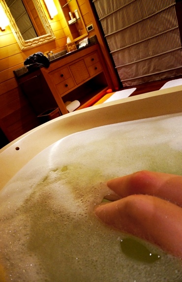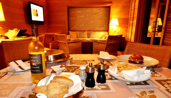 ↓ 在 Bora Bora 的最後一夜,因為太喜歡這間水上屋,決定留在水上屋內吃晚餐,順便把收到的白酒喝掉。這次的經驗告訴我們:記得要提早打電話去,我們等了整整45分鐘至1個小時食物才送來,幸好在等待期間我在看日劇,而麥包則睡了一覺,不至於坐着乾等。可以選擇在室外的涼亭或室內的飯廳吃晚餐;如果是午餐的話我會選擇坐室外,景色比較好,但晚餐就選擇室內吧。鋪好桌布,送上食物和各式各樣的調味品,和在餐廳內吃差不多。