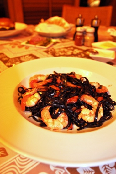 ↓ 而我則點了「大蝦墨魚汁麵」。大蝦還不錯吃,但麵條略嫌乾了一些,應該是少了醬汁的關係吧!其實我比較喜歡吃完之後整個嘴巴黑掉,有醬汁的墨魚汁麵,特別是在自己房間內吃,不怕嚇到人嘛。