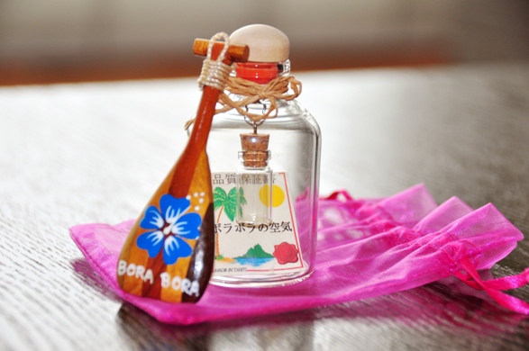 ↓ 可愛的"瓶中瓶"購於《Four Seasons》內的手信店,有一張可愛的"Bora Bora 空氣"品質保證書,我本來打算在小瓶內放些 Bora Bora 的沙,大瓶放一半海水;麥包說海水會蒸發,不能長久保存,所以最後改放了一半沙灘的沙在大瓶內,小瓶就真的帶回來了"Bora Bora 空氣",哈哈!還在機場看到烏克麗麗造型的磁鐵(我有收藏到過地方磁鐵的習慣)。