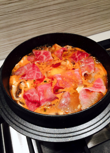 ↓ 晚餐吃韓式海鮮豆腐鍋配和牛,這次買到的雪花紋理很美。
