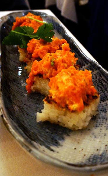 ↓廚師也另外幫我們選了 [Spicy Salmon on Crispy Rice],加了日式mayo和辣醬的鮭魚碎肉放在烤過的飯團上,說是這裏很受歡迎的,我覺得有點肥膩,但麥包很喜歡吃。