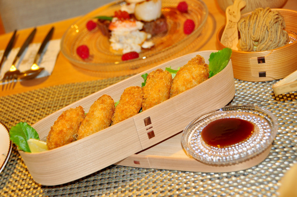 ↓ 一口菜有買回來的「酥炸生蠔」,把牠們重新擺盆感覺就漂亮多了;至於份量方面也不少,每隻生蠔看起來像炸雞翼一樣大,灑上檸檬汁,沾上有點像日式炸豬扒的醬汁一起吃。