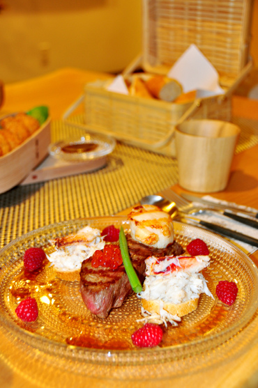 ↓ 西餐的前菜比較喜歡吃沙拉來均衡飲食,佐以覆盆子和當季的柿子,加上 vinaigrette 醬汁。