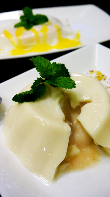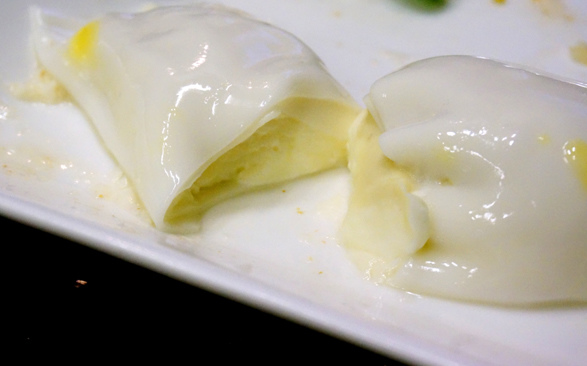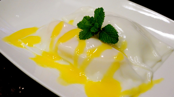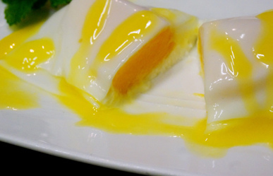 ↓ 外皮長得很像腸粉,吃得出並不是腸粉,但又不確定是什麼,就是吃起來非常嫩滑。內餡是一片新鮮芒果肉,外面淋上了芒果汁,可能芒果季節已過的關係,芒果肉沒有很甜,有點可惜,不然應該是很好吃的一道甜品。
