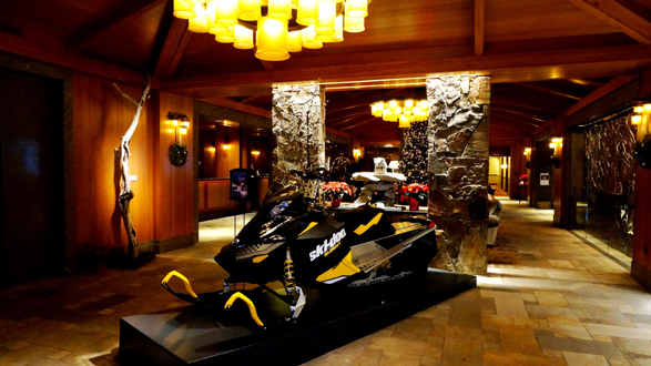 ↓ 大堂裝潢以木與石為主,正入口放了snowmobile。