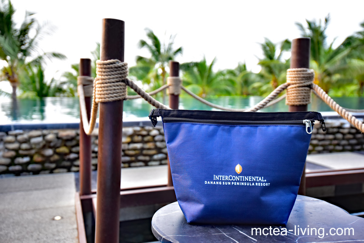無論是在泳池或沙灘,只要一坐下,員工就會送上這個小包,包含了冰凍的礦泉水和防曬修護用品等等。