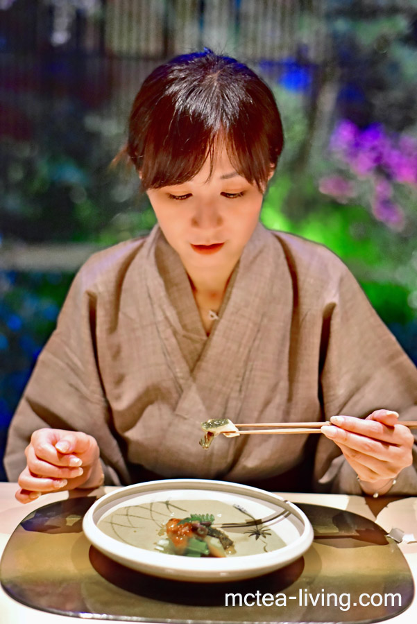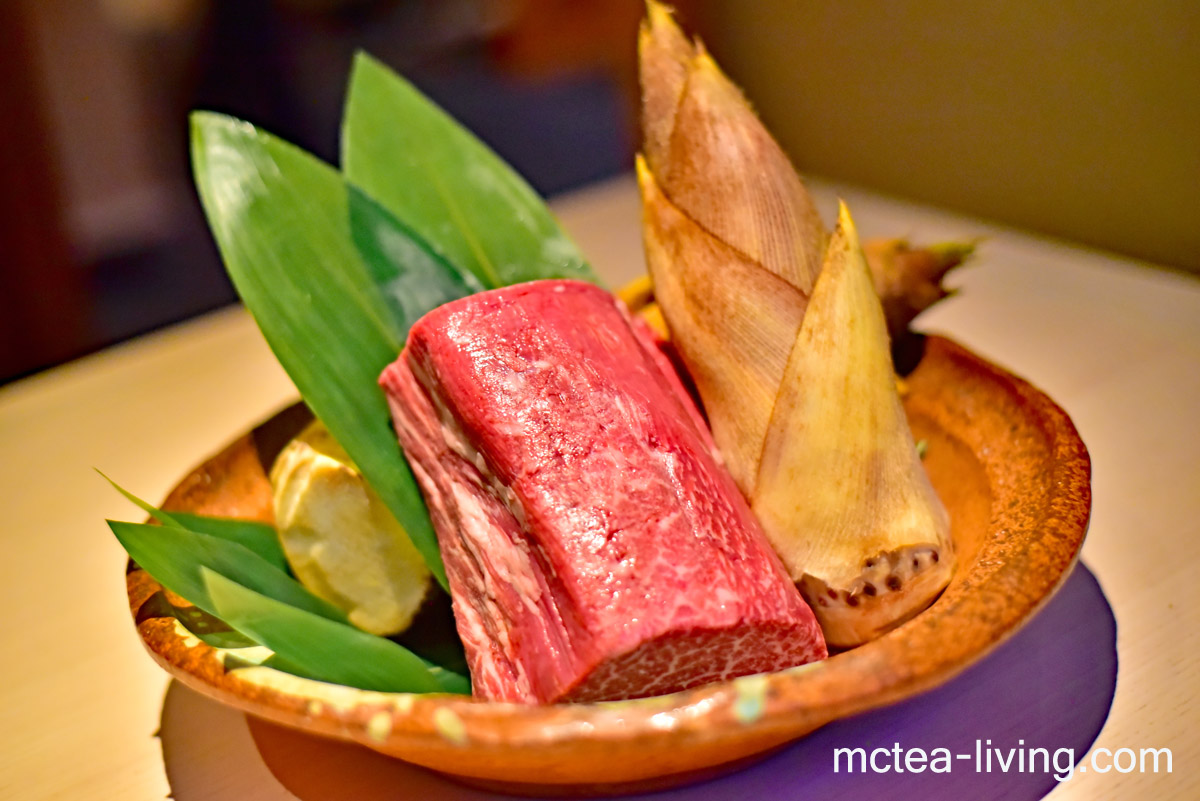 《ふふ 京都 | FuFu Kyoto》只有一間餐廳「庵都」,我們的晚餐和隔天的早餐都在這裏享用。晚餐部份提供日式懷石料理,和許多溫泉旅館一樣,《ふふ 京都》很注重使用時令的食材,特別是京都的京野菜。我在一休網站上訂房時看到了以夏多布里昂牛排(Chateaubriand)和竹筍為主要食材的懷石料理晚餐,想來比以蔬菜為主的常規懷石晚餐更為吸引,就下訂了。