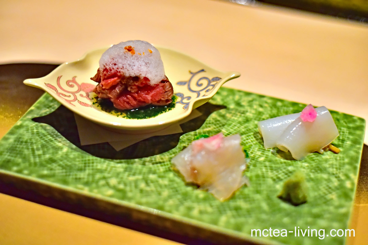 壽司部份有生牛肉配泡沫醬油,很有法國菜的風格;另外兩款是魷魚和忘記了是什麼的白身魚,全部都非常好吃。