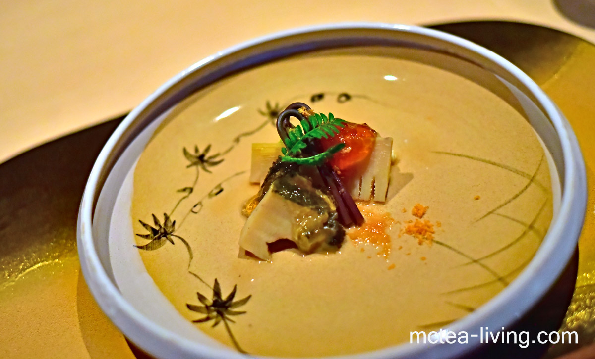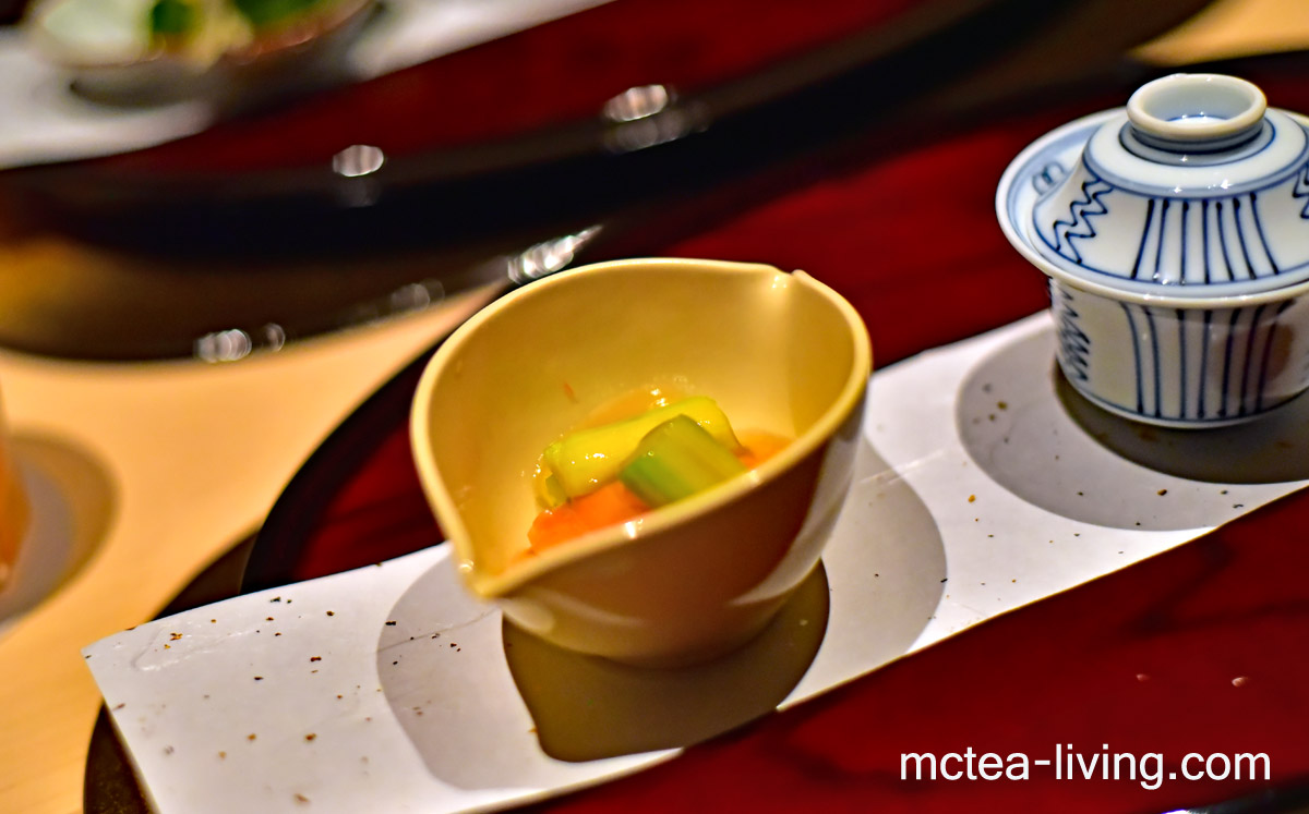 第一道開胃菜是筍和蒸鮑魚,配上一些啫喱狀的各式調味,都是以清爽的橘子為基底,名副其實,非常開胃。