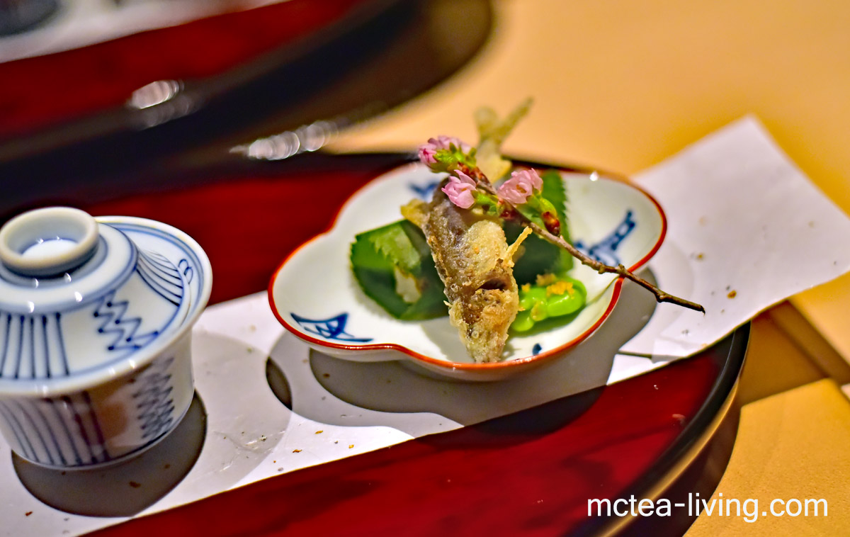 第一度看到的是唐揚鮎魚,後面有用櫻花葉包着的蛤壽司,很好吃。