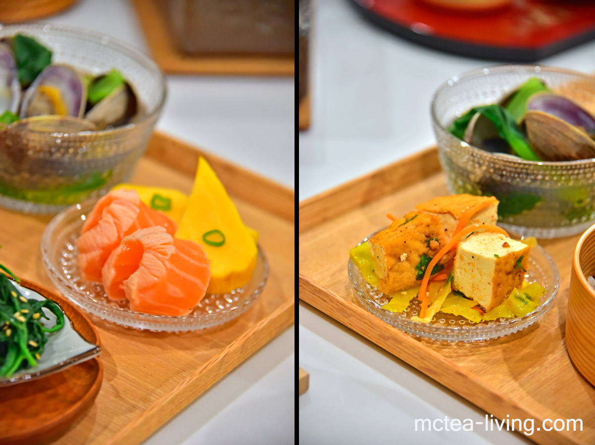 其餘兩份前菜分別是《玉子燒+鮭魚刺身》和《涼拌豆腐》。前者非常容易做(不用煮);後者是買現成已經涼拌好的。鮭魚非常肥美,其他都還不錯吃。